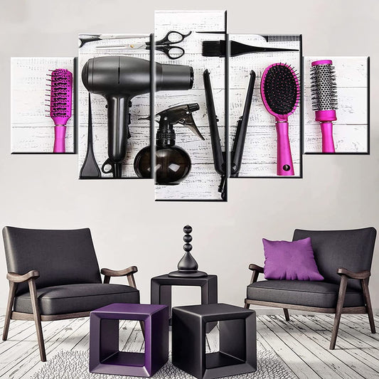 Zemalous Salon Wall Decor for Hair Stylist Barbershop 5 Panel Canvas Salon Wall Art Pictures Haircut Hairdresser Tools Paintings for Living room Home Framed Stretched Ready to Hang Posters and Prints