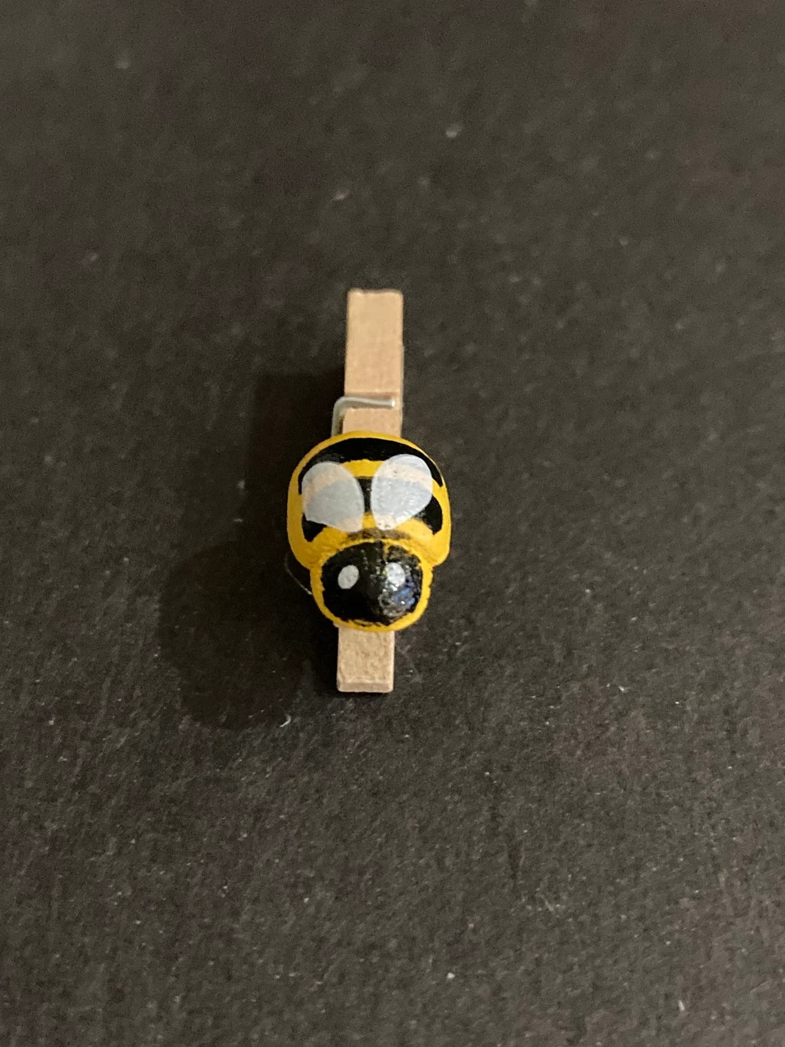 They are made from mini wooden pegs with little black and yellow wooden painted bee shapes on them.